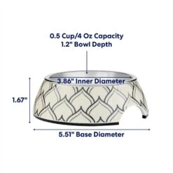 - Ceramic bowl with graphics printed on the side elevates your pet’s dinnerware.